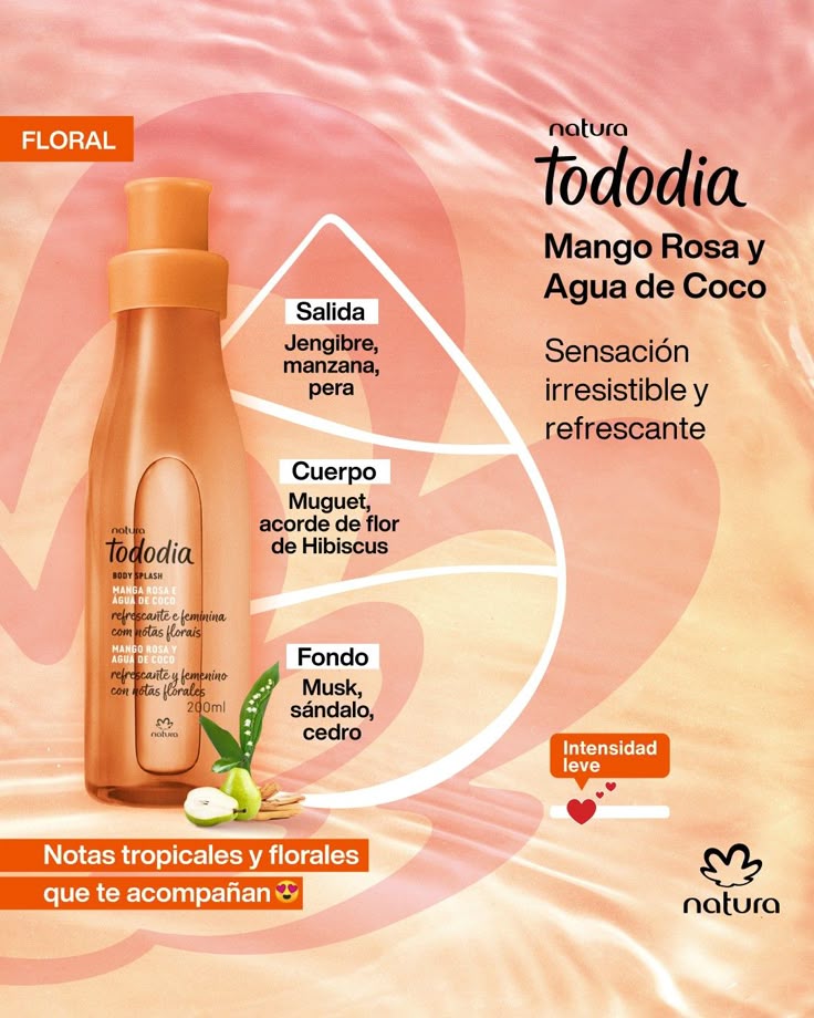 Fragancia ligera y refrescante con notas frutales y tropicales. Ideal para usar después del baño o a lo largo del día. Su combinación de mango rosa jugoso y agua de coco cristalina crea una sensación de energía, bienestar y alegría.