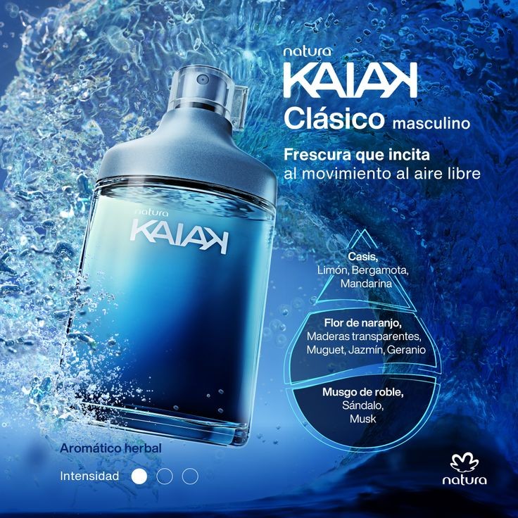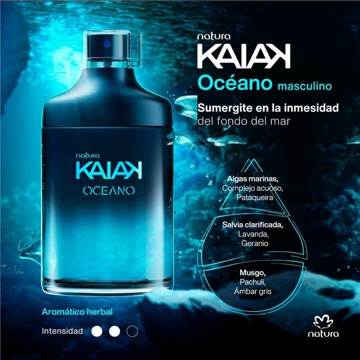 Kaiak Océano es una fragancia masculina inspirada en la fuerza y profundidad del mar. Combina notas marinas con un fondo vibrante que transmite energía y vitalidad.