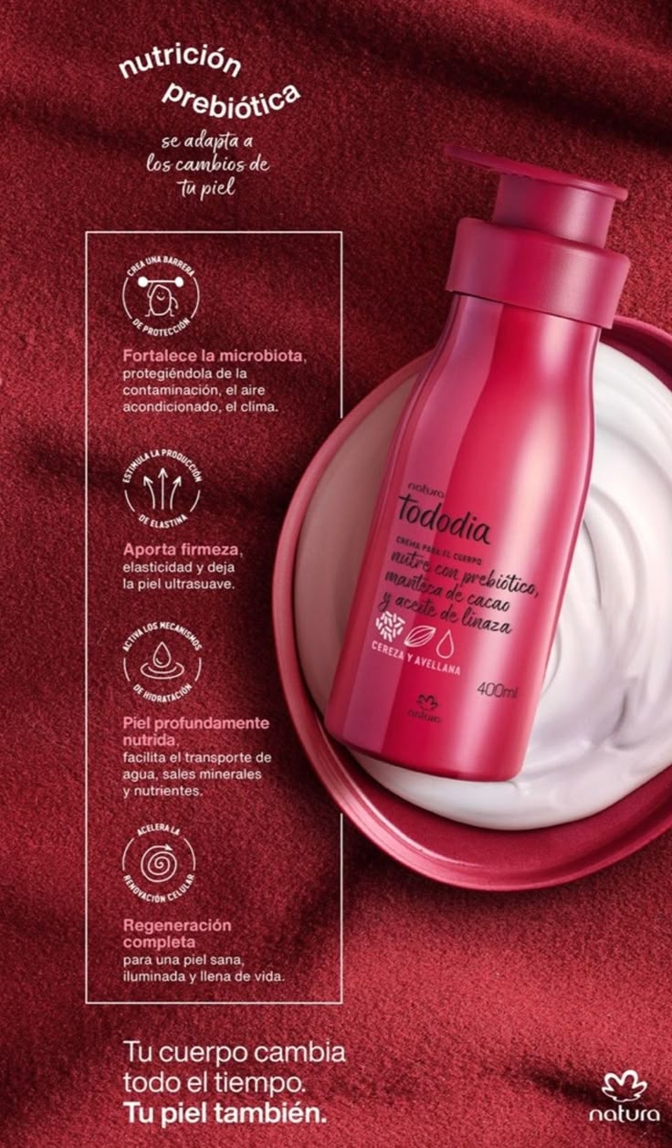 - Su textura nutritiva brinda suavidad y perfume envolvente, con una fragancia que equilibra lo frutal y lo cremoso.