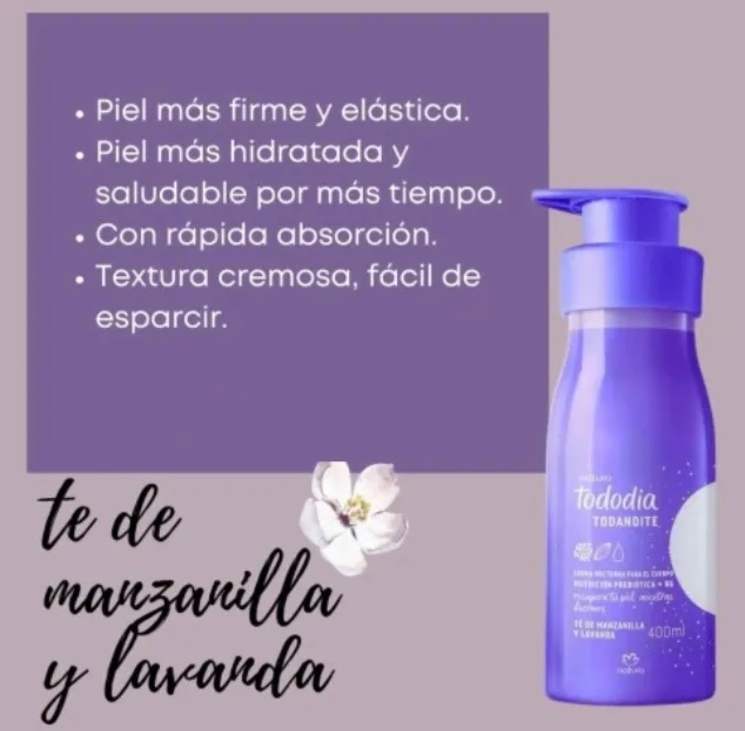 Descubrí el Tododia Hidratante Corporal 400gs en su delicada fragancia de Té de Manzanilla y Lavanda, una combinación exquisita que transforma tu rutina diaria en un momento de puro bienestar y cuidado. Esta crema hidratante está pensada para quienes buscan una hidratación profunda acompañada de un aroma relajante que calma los sentidos.
